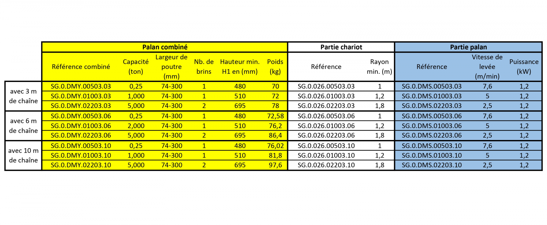 | Code de l'article | CMU (t) | Prix avec 3 mètres (€) | Prix avec 6 mètres (€) | Prix avec 10 mètres (€) |