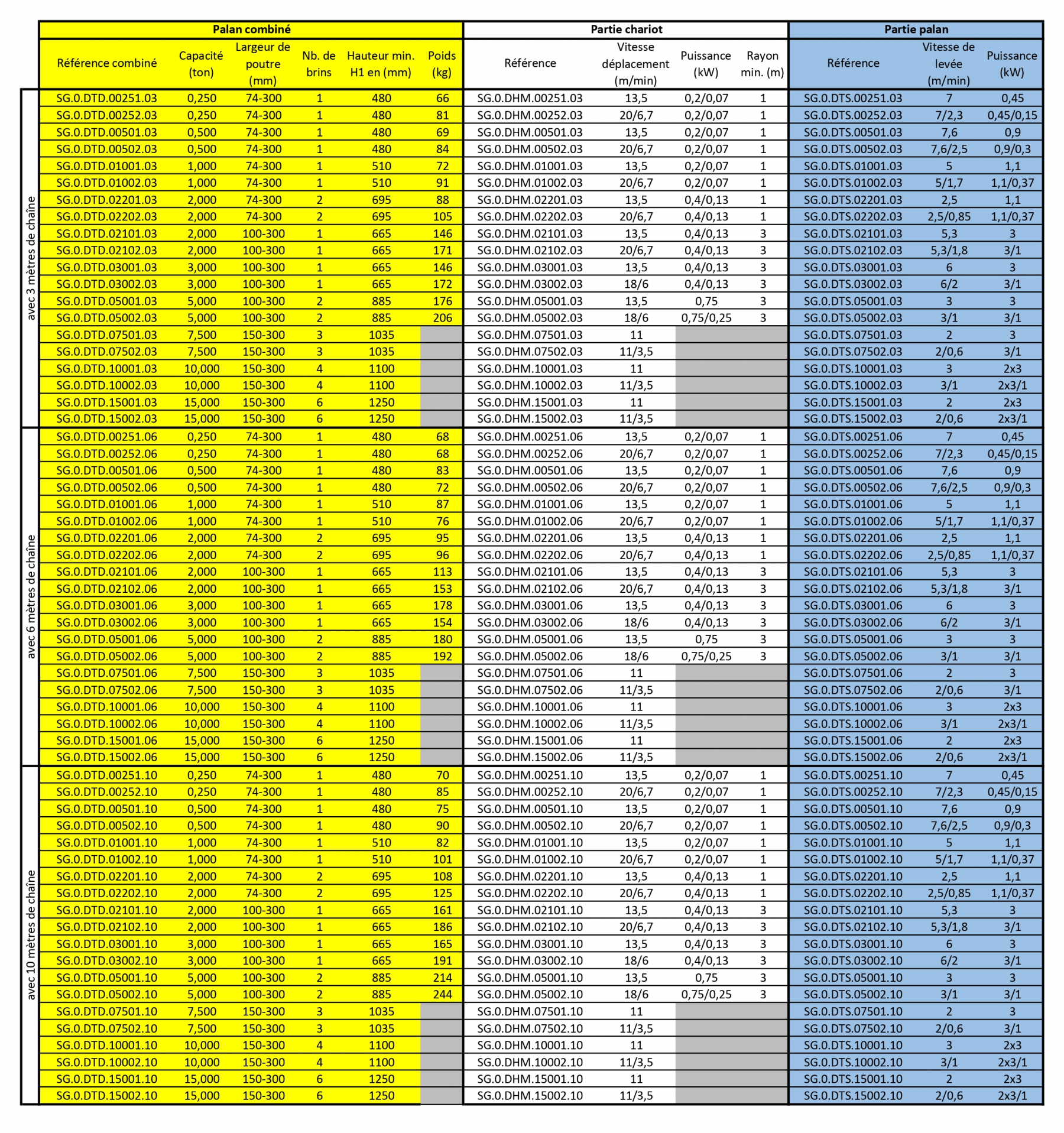 | Référence palan + chariot | CMU (t) | Prix avec 3 mètres (€) | Prix avec 6 mètres (€) | Prix avec 10 mètres (€) |
