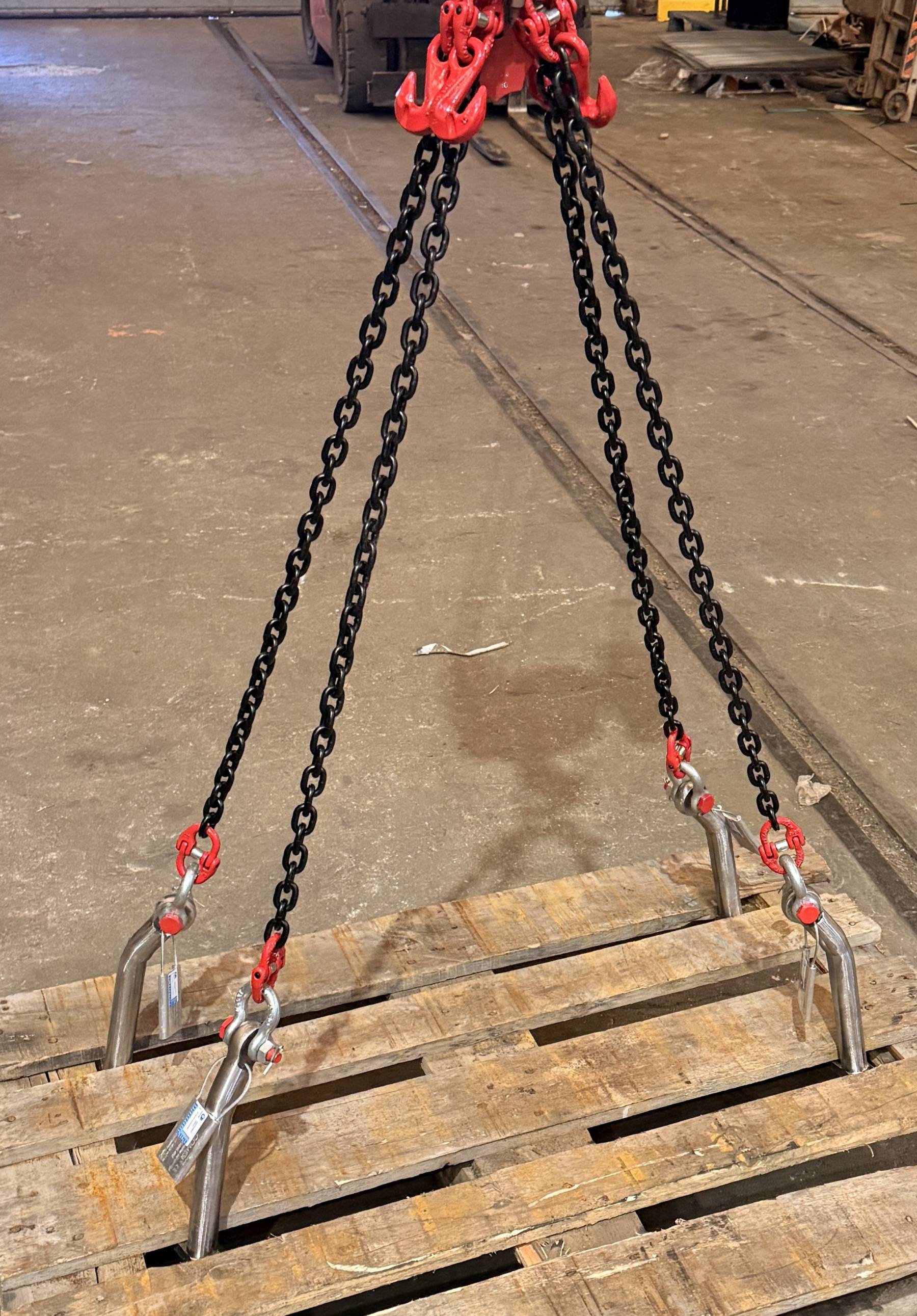 La note de calcul (réalisée par notre bureau d'études) peut être fournie en option, elle tient compte du type de palonnier, de la hauteur, de la longueur, de la capacité du palonnier, de la qualité de l'acier ou inox, réglable ou pas, en fonction des accessoires (élingues câbles, élingues chaînes, élingues textiles, crochet tournant, crochet automatique, manilles, lyres ou droites, pinces)...